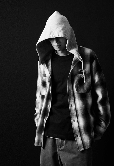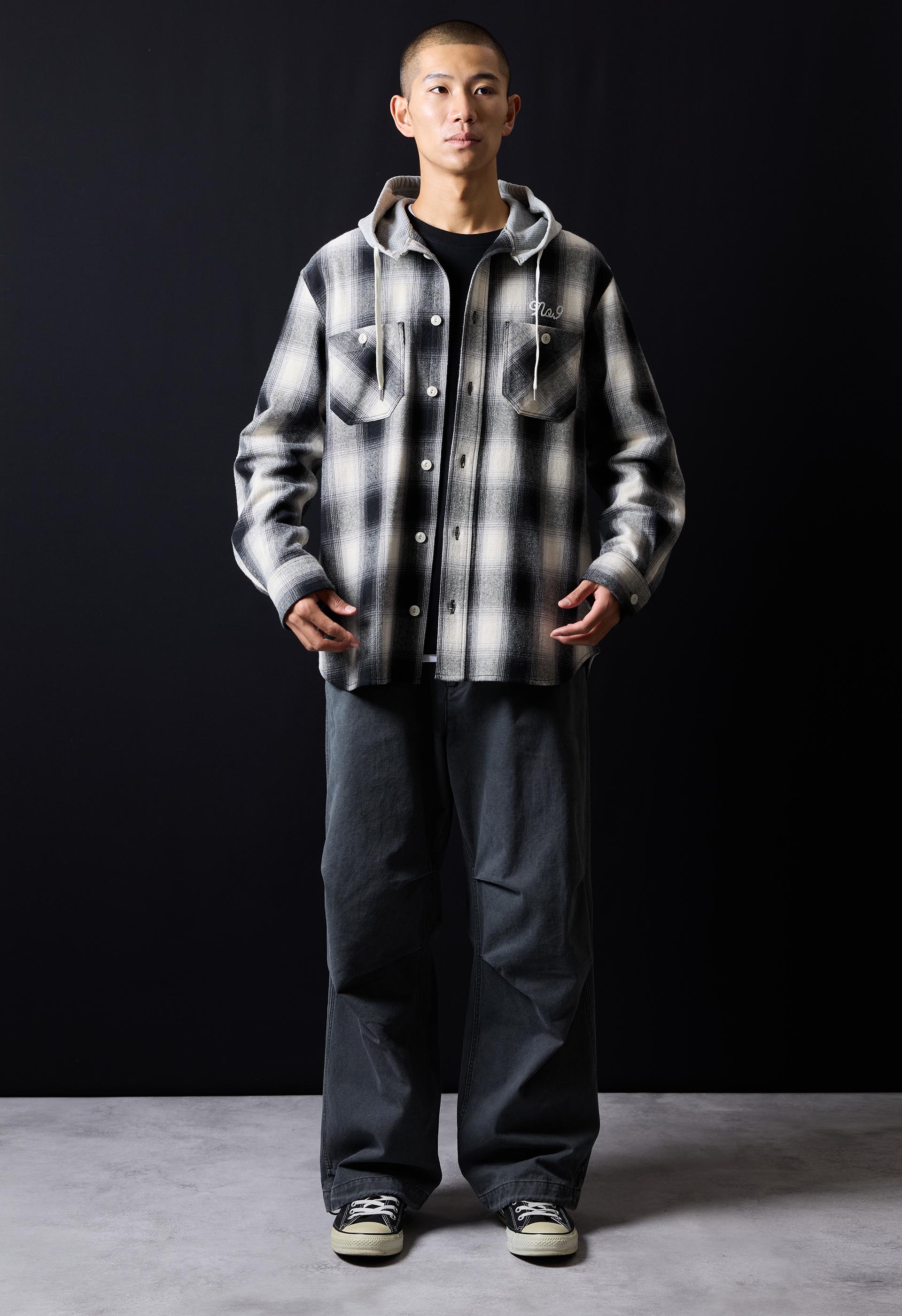 BRUSHED COTTON OMBRE PLAID FLANNEL EMBROIDERY BACK LOGO HOODIE SHIRTS