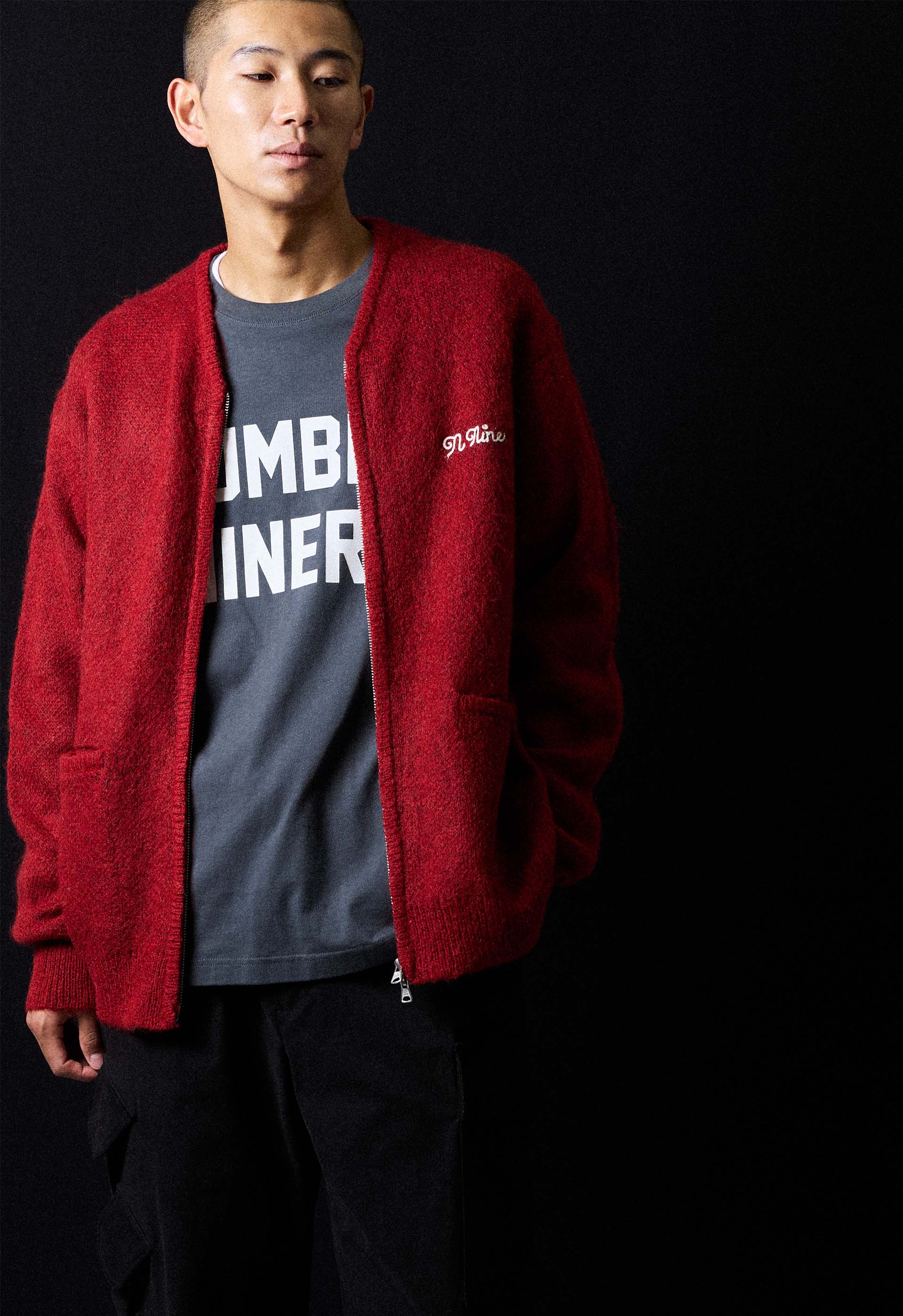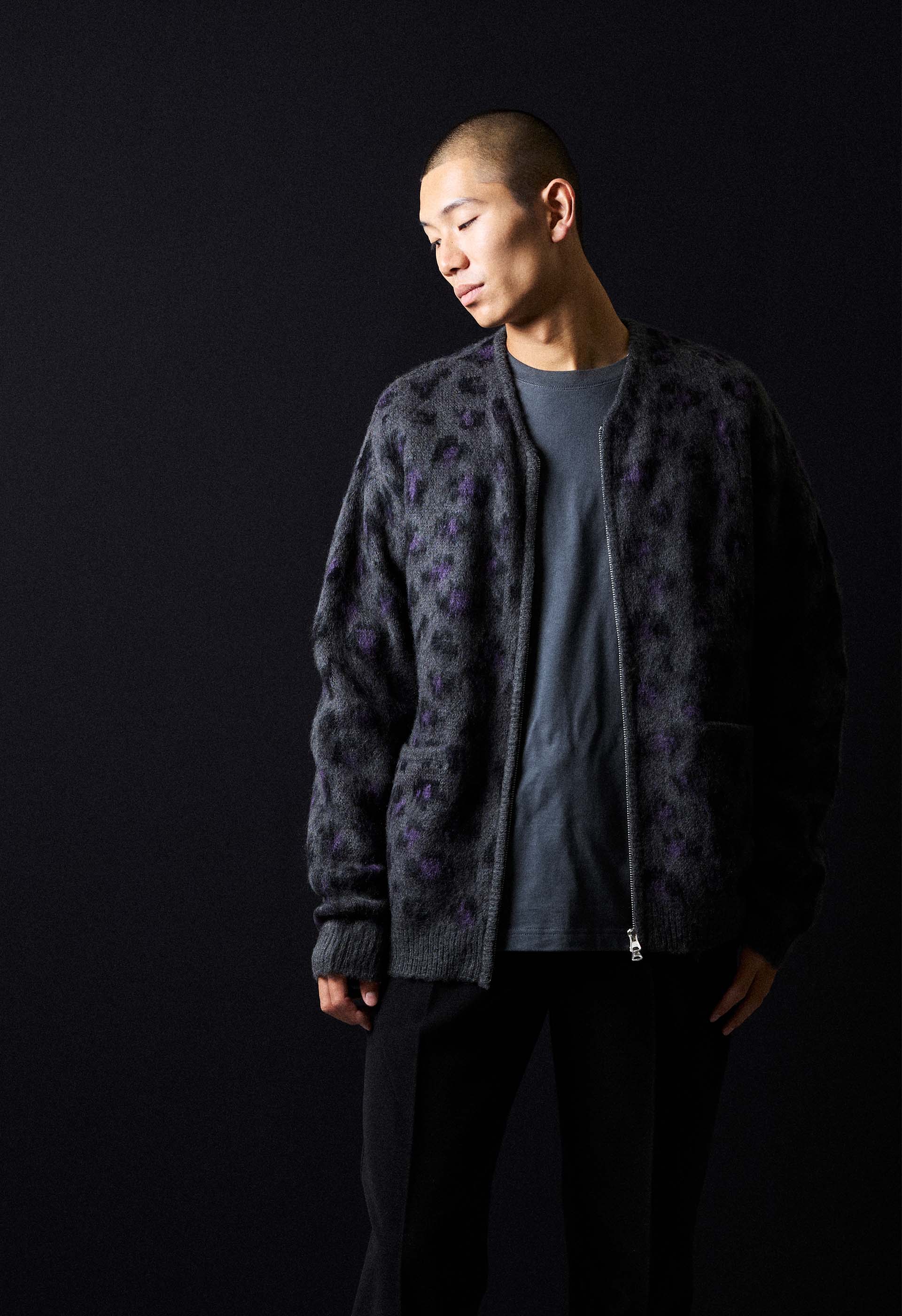 MOHAIR SOLID JACQUARD KNIT ZIP-UP CARDIGAN